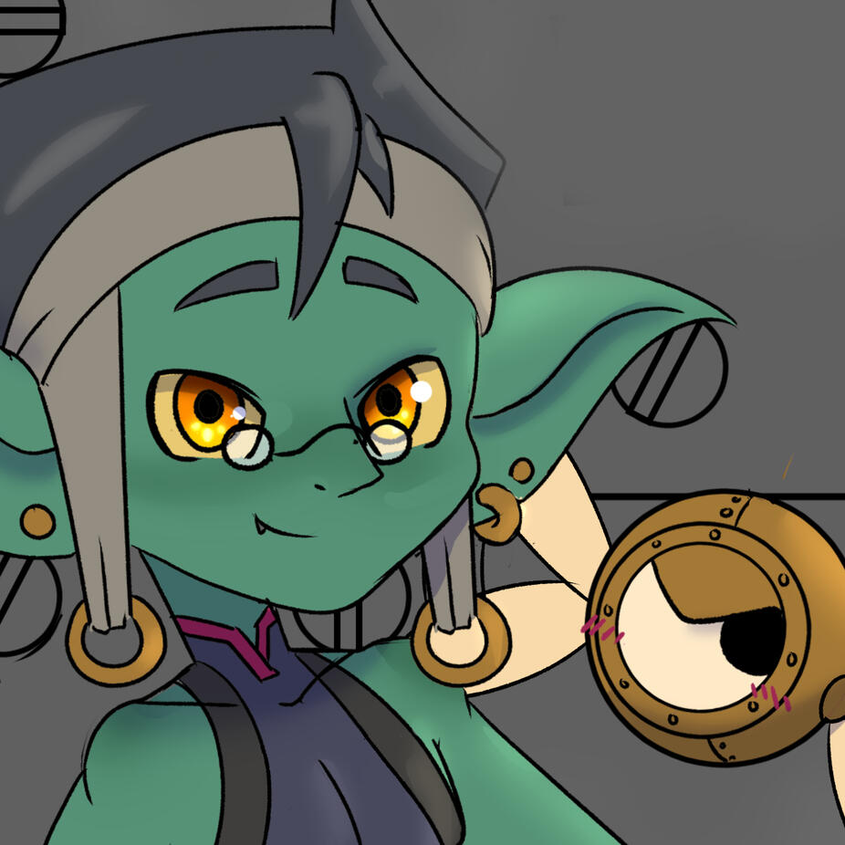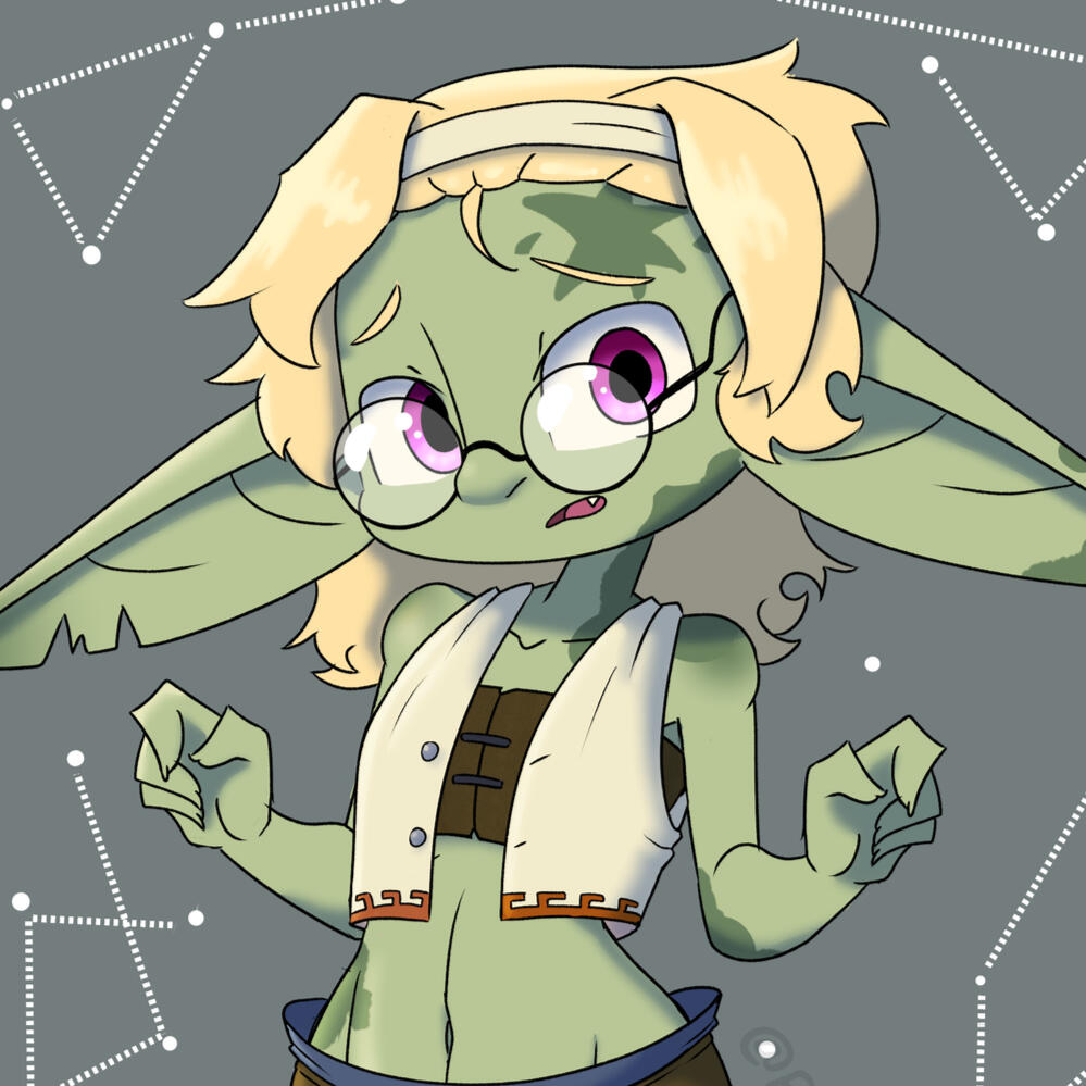 Once a Ships goblin, he was used for his skills upon many a ship. he would be capture by pirates at one point and escape that life due to the help of Bonna-Ray. He works as a tour guide and server at the resort and much enjoys this life over his old one. his room is a mix of highly scientific star charts and very un scientific star signs and zodiac readings. they are often dragged around on advanturers by Bonna -Ray. He has also developed a few crushes on the women of the resort and often avoids them as to not get flustered. is very easily overwhelmed and spends most days alone but happy.
